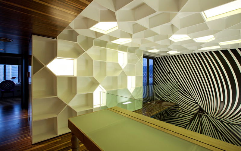 - 都市生活是快節(jié)奏的樂章,簡潔有力則是這篇樂章最相稱的和弦音。本案中設(shè)計師緊扣簡約、雅致的風(fēng)格調(diào)性,在開辟出強大的使用功能和儲物功能的同時,對這個復(fù)式小樓重新做出戲劇性的布局: 開放式的廚房和加長的島臺使得家人、朋友可以盡享互動的樂趣;極富樂感黑白線條放肆的流動游走,白得極致的格子書柜貫穿二層的開放式書房甚至布滿整個天花;一個運用清玻和黑色鏡鋼以及玉砂夾膠鏡搭建的跨越客廳上空的L形天橋,讓動靜分明的功能分區(qū)也由此而獲得自然的過渡,空間也因此有了極強的層次感。而那一抹極為耀眼的芥末黃更是變成了樂譜上跳動的音符,劃破了本來的寧靜,為這個家?guī)砹松畹膼倓印>牡臉?gòu)思及巧妙的用色,使得整個空間宜動宜靜,樂活而又型格。
