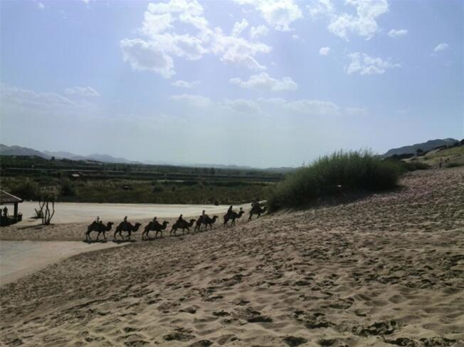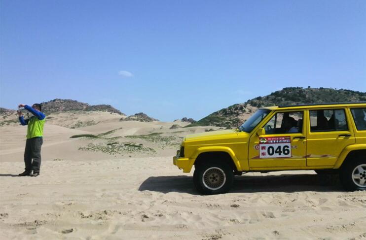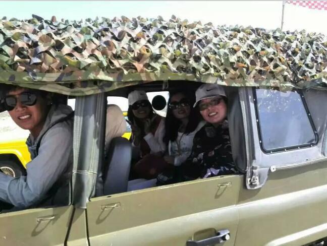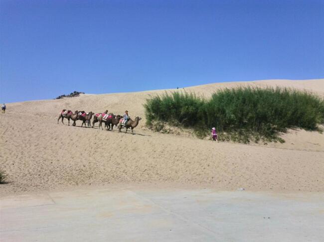 車子駛進(jìn)玉龍沙湖的停車場(chǎng),我的思緒由漫漫歷史回到眼前景色。小小的一個(gè)湖,大大的看不到邊際的沙漠。據(jù)說這就是歷史上有名的科爾沁草原,現(xiàn)在也只能叫科爾沁沙地了吧。湖水的面積越來越小,湖水周圍一片小小的綠洲,綠洲外圍就是望不到邊際的沙漠。在我們出行前,旅行社的對(duì)這里的描繪是這個(gè)樣子:“讓您感受茫茫大漠、沙丘滾滾,連綿起伏的雄渾與壯美,金黃色的沙坡掩映在藍(lán)天、白云下,有一種茫茫沙海入云天的壯麗景象。觀賞陰石、陽石、石長(zhǎng)城等沙漠奇觀,體驗(yàn)夢(mèng)幻沙漠所帶來的無限驚奇!边@里說說的我的實(shí)際感受:沙子很白很細(xì),光著腳踩上去很燙,爬到沙坡上面,我的腳已被燙的發(fā)紅。站在沙坡上面遠(yuǎn)望,沙丘滾滾,連綿起伏是真實(shí)場(chǎng)景,但是我卻不能和雄渾、壯美等詞匯聯(lián)系在一起,也許是受后邊幾日景色的干擾,也許是在港城海邊也有很多沙地的原因,沙地并不算這幾天旅行中的美景。在玉龍沙湖的游覽中有兩點(diǎn)最記憶猶新:越野車和兩部電影的外景地。這里有兩個(gè)自費(fèi)項(xiàng)目,越野車和騎駱駝,我選擇了越野車。交了錢分了組后,我和馬姐、小費(fèi)、小霍四人一車,聽導(dǎo)游說越野車很怕人,那三人就一下做到了后排,我只好做到副駕駛位置。記好安全帶后,司機(jī)帶我們沖進(jìn)沙漠深處,一開始道路還算平緩,我們的心也是平緩的,坡度逐漸陡峭起來,后排三位的叫聲也越發(fā)尖銳,突然一個(gè)幾乎90度的坡沖下,車子似乎好像失去了重力,直接下去了,后排三位女士的聲音已經(jīng)不只尖銳了,近乎聲嘶力竭,我坐在前排,可能是能看到下邊的原因,并沒有覺得如此可怕,只是覺得很爽。越野車就這樣起起伏伏的狂奔了20分鐘又回到了遠(yuǎn)點(diǎn),驚險(xiǎn)刺激,對(duì)的起120元的價(jià)位。這里是電影《萬物生長(zhǎng)》和《后會(huì)無期》的外景地,《萬物生長(zhǎng)》中范冰冰和韓庚的激情戲就是在這片沙子中拍攝的,就沖這個(gè)我也要光腳在沙堆上走一走;據(jù)劉繼偉說他看到了《后會(huì)無期》中的那顆衛(wèi)星,我卻已經(jīng)走累了,不去再看那顆衛(wèi)星了和大伙坐在山地旁邊的亭子里休息,順便看看別人騎駱駝。不到4點(diǎn)的功夫我們都已經(jīng)從景區(qū)出來了,坐車去往翁牛特旗的旗政府烏丹吃飯休息。