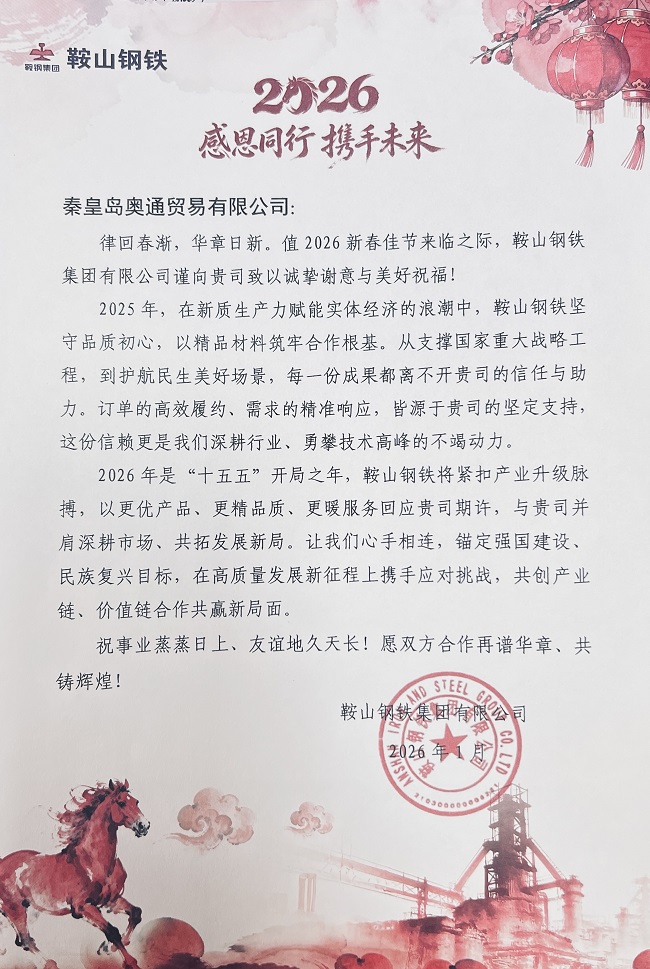 近日,我司秦皇島奧通貿易有限公司收到來自鞍山鋼鐵集團有限公司的2026年新春賀函。這份來自國內鋼鐵行業(yè)領軍企業(yè)的誠摯祝福,既是對過去一年合作成果的高度認可,也是對雙方未來共贏發(fā)展的深切期許。